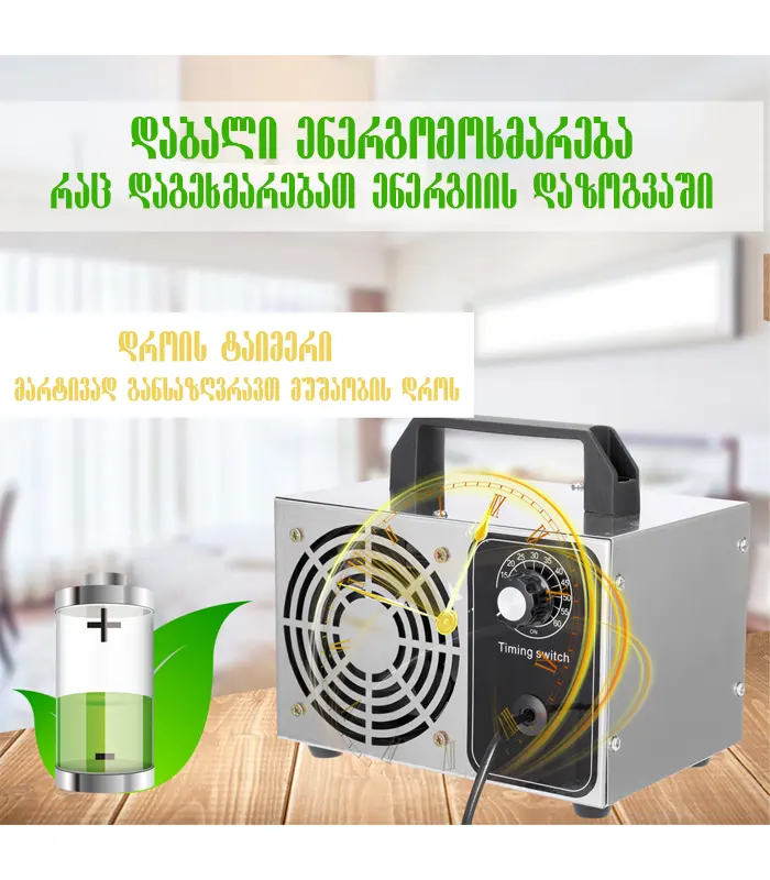 • ეფექტურობა — 1გ ოზონი = 35 მ³ ჰაერი / სთ.